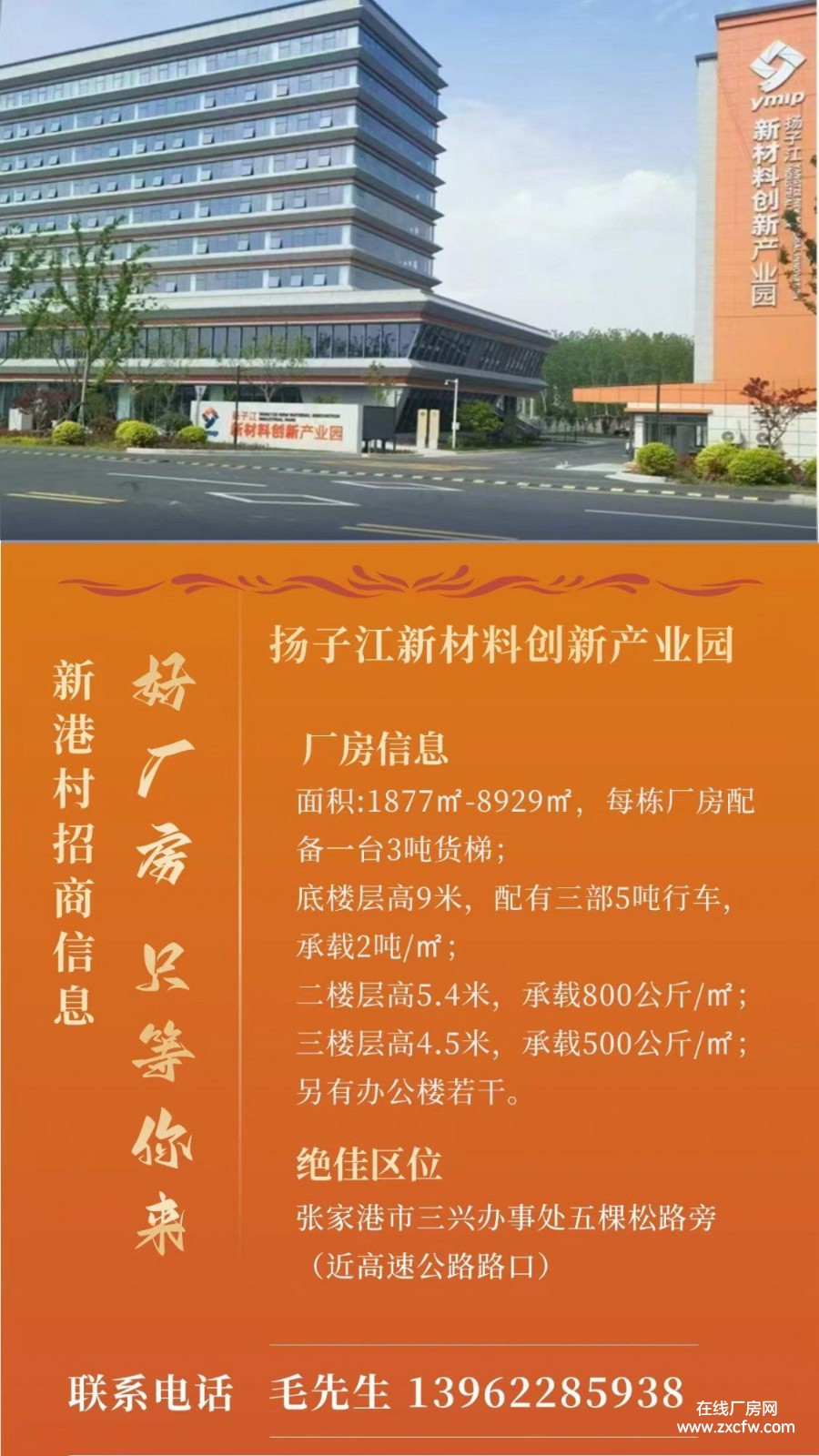 ·厂房招租:扬子江新材料工业园区标准厂房(配3吨货梯、5吨行车),十层办公写字楼。