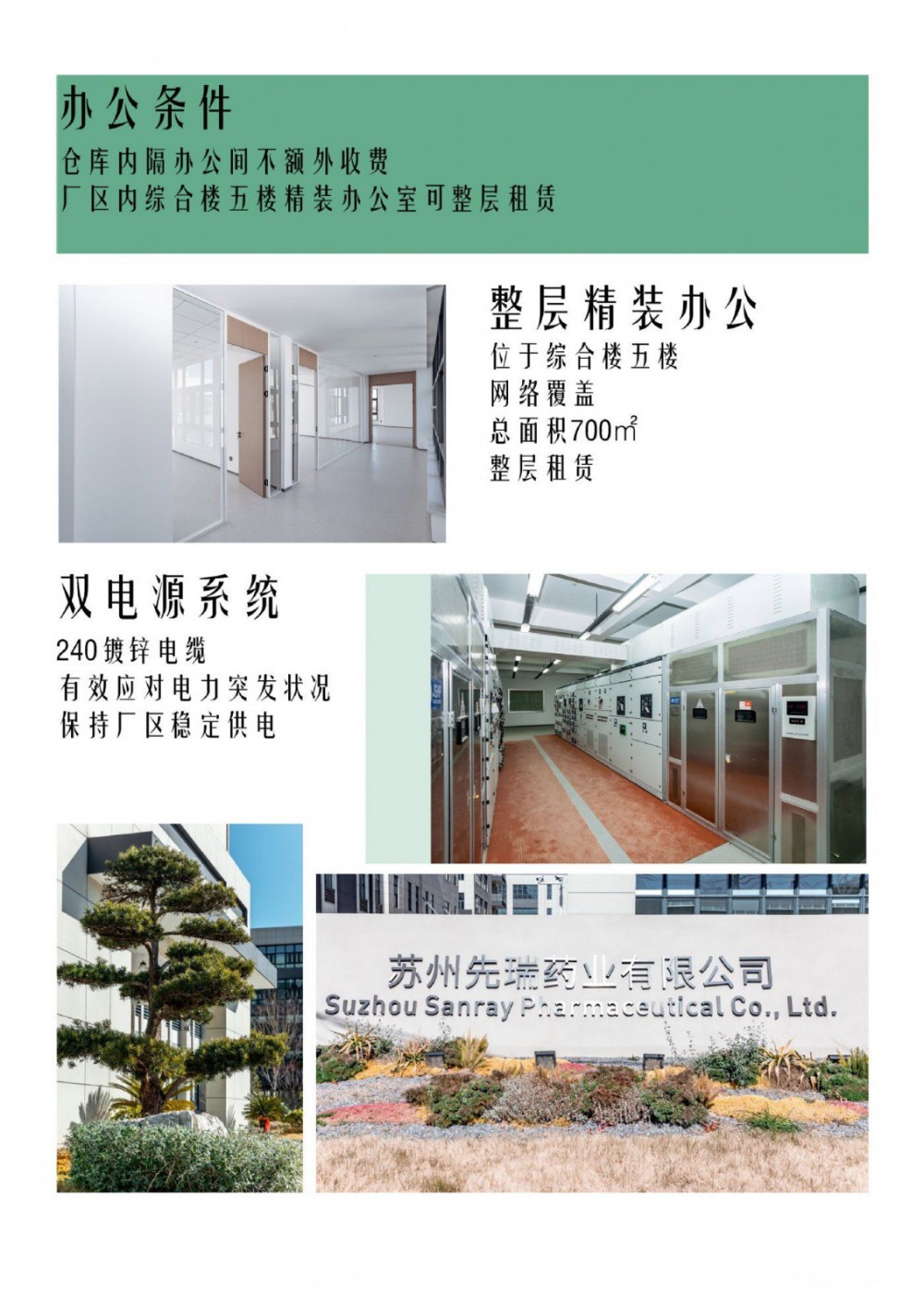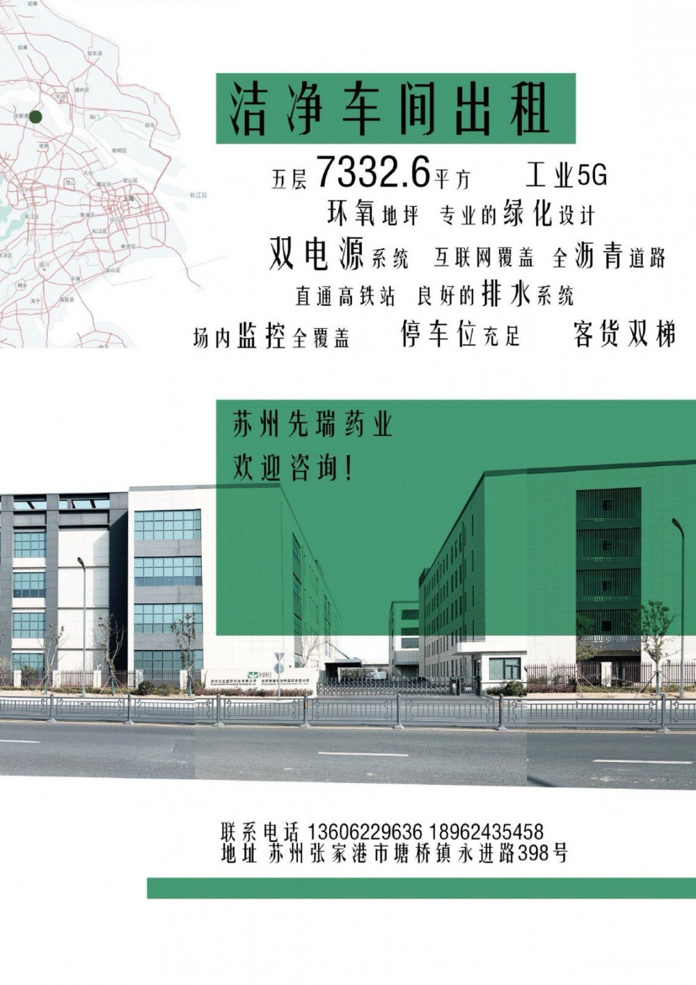 洁净车间位于苏州先瑞药业内部,无其他楼栋对外出租。此车间整栋或分层出租,一共5层,产权面积7332.6平方米,每层空间一样,丙类消防,环氧地坪,层高4.5米,客货双梯。距离张家港高铁站5分钟车程,停车位充足。厂区有双电源系统,工业5G全覆盖,监控完善。如整栋租赁,免费提供独立现代精装办公室700平方米。